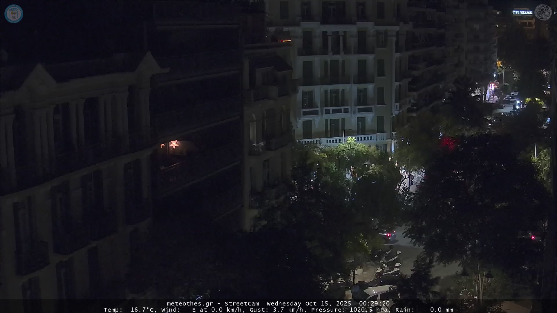 Η κάμερα αυτή, αποτελεί μέρος του Μετεωρολογικού Σταθμού στο Ιστορικό κέντρο της Θεσσαλονίκης. Θέα προς Ν-ΝΔ. Αυτόματη ανανέωση κάθε 20 δευτερόλεπτα. Δείχνει: ΝΔ μέρος της Π.Π. Γερμανού, που διασταυρώνεται με τίς οδούς Παύλου Μελά, Τσιμισκή, Μητροπόλεως, Κόυσκουρα και καταλήγει στη Λεωφόρο Νίκης δίπλα στη θάλασσα. |